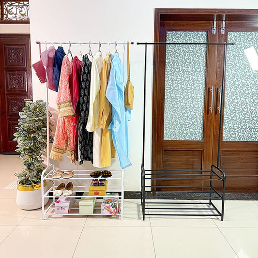 Dual Pole Metal Clothes Stand by Matrix (C) – With Dual Shoe Tiers & Side Hooks